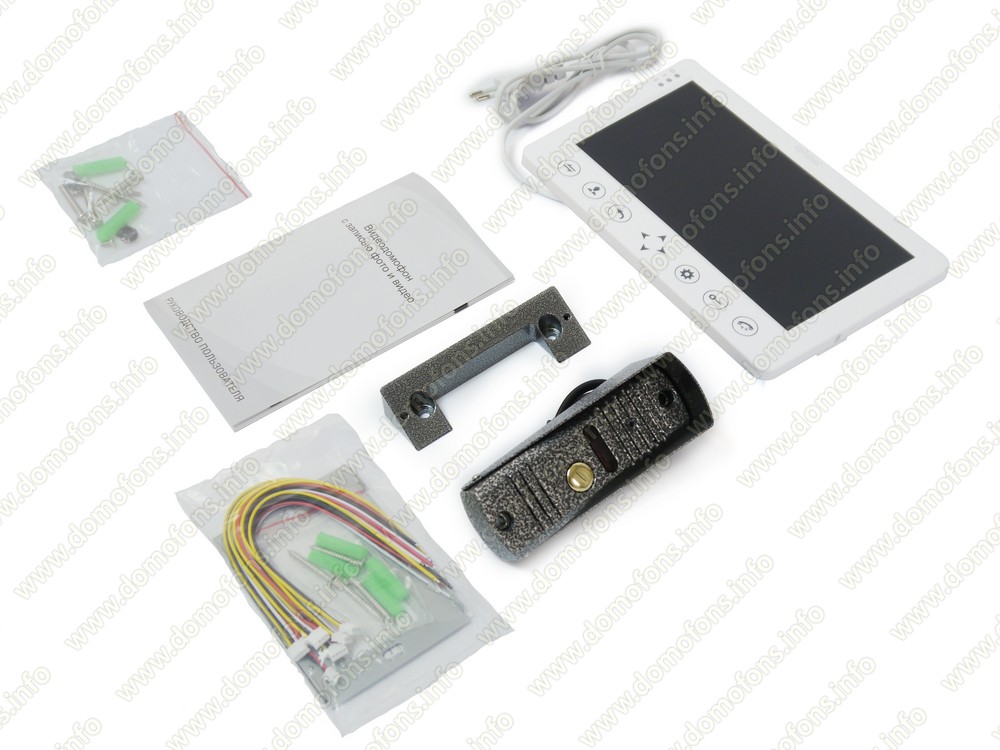 Крепеж в комплекте. Кронштейн монитора и панели, разъемы для подключения, а также угловой кронштейн с козырьком поставляются в комплекте с домофоном.